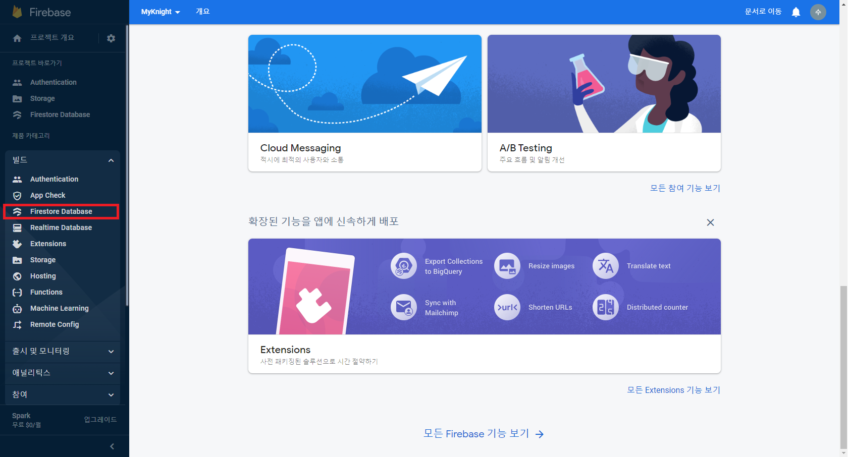 이를 해결하는 방법은 우선 해당 Firebase Console로 이동한다. 그리고 아래와 같이 Firestore Database를 클릭한다.